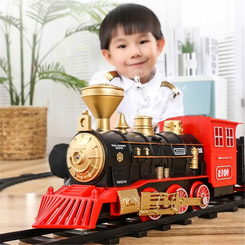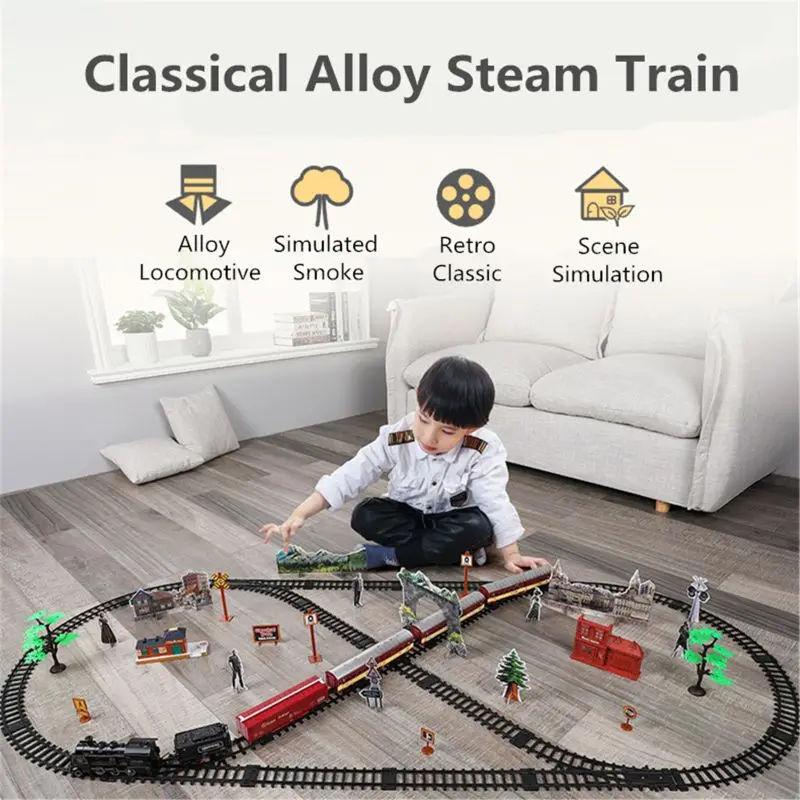 Electronic Classic Railway Train Sets w/ Steam Locomotive Engine Cargo Car and Tracks Battery Opera